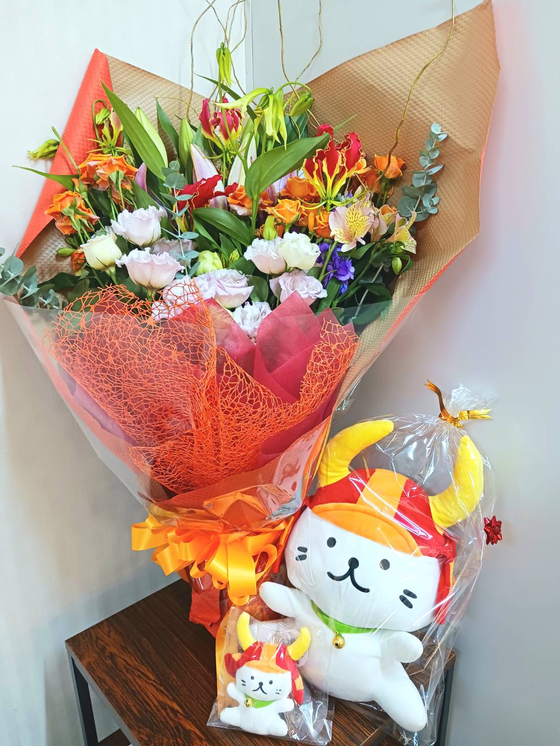 写真は頂いたお花と、客席のお客さまからプレゼントして頂いたひこにゃんで〜す。