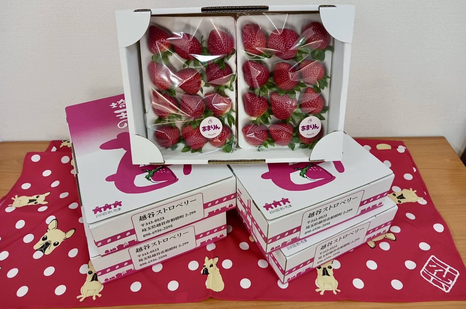 佐々木さん&北斗さんご夫妻から頂戴しました苺。 め〜っちゃ甘くてジューシー! (((o(*゚▽゚*)o))) 採れたての新鮮な苺に、バンドメンバー、スタッフ一同、大喜びでした! *\(^o^)/* 私もしっかり味わって頂きま〜す。 ありがとうございました。 m(_ _)m そして、かわいいワンちゃん付きの風呂敷は、震災の時にもお水が漏れずにバケツ代わりに使える優れ物なんだそうです。 素晴らしいアイデアですね! 大切に使わせて頂きます。 m(_ _)m